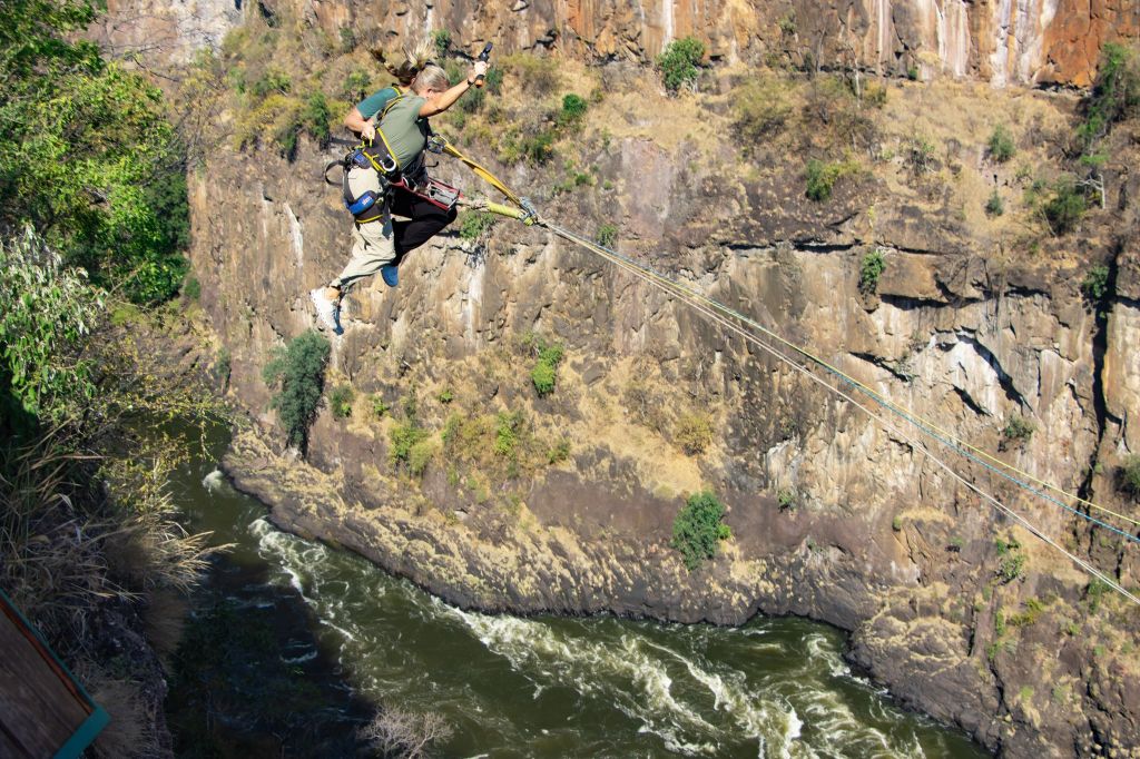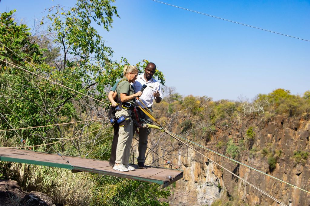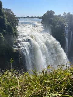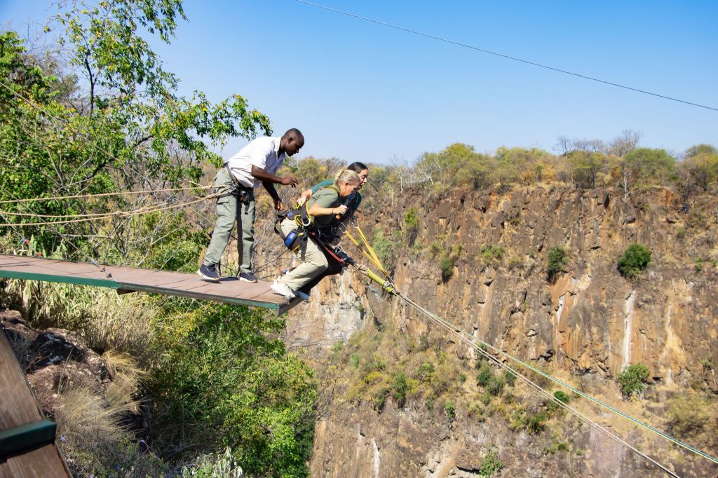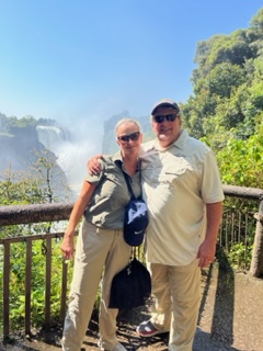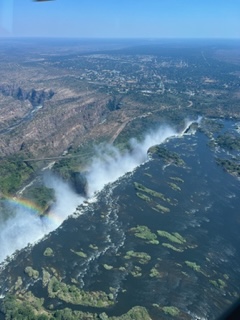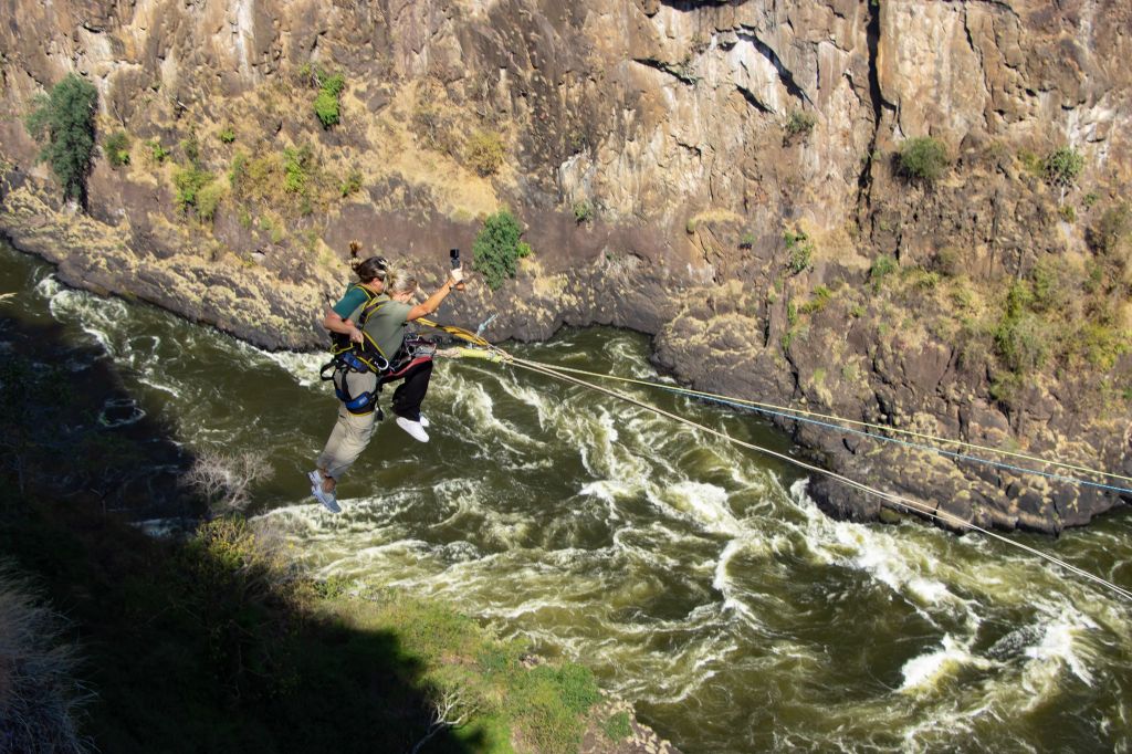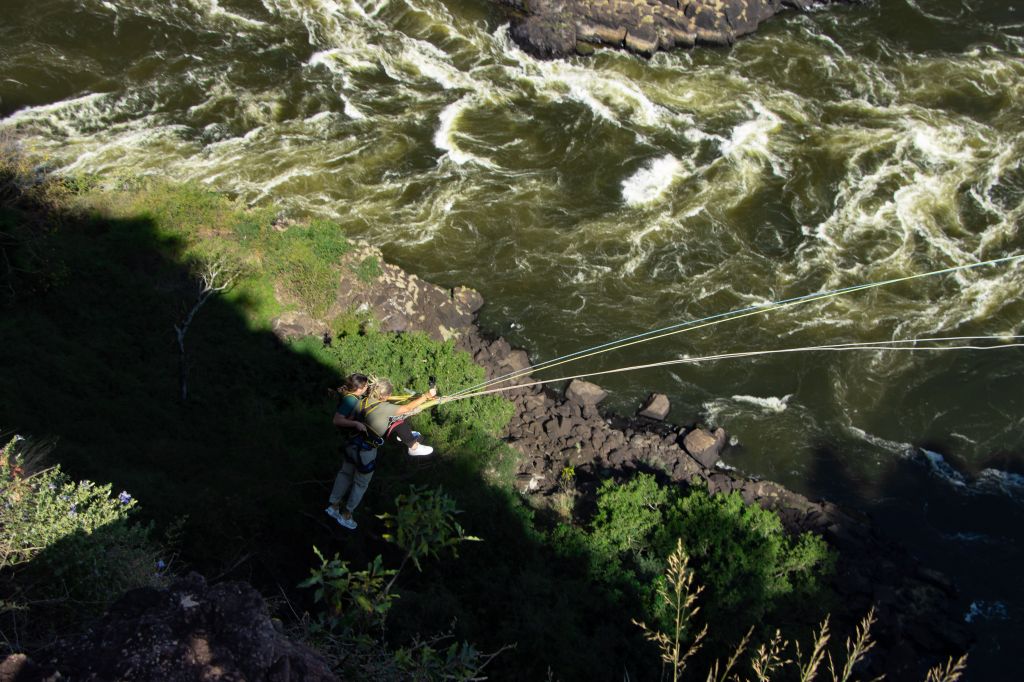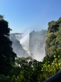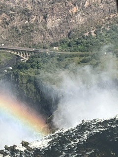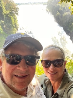 One day we took a bus to Victoria Falls, Zimbabwe. Victoria Falls is created from the Zambezi River as it plummets over the edge dividing the countries of Zambia and Zimbabwe and is considered one of the 7 Natural Wonders of the World. After visiting, we completely agree. Sprays can be seen from miles away and it spills more than 17 billion cubic feet of water per min. π¦ During certain season, you can jump into the water at the top of the falls called Devil’s Pool but we weren’t in that season so we had to settle for a different kind of adrenaline high….a swing across the canyon over the Zambezi River!!!! Charlie wasn’t up for it, so I rode tandem with a young gal from Seabourn. We strapped in and after stepping of platform did about an 80 meter freefall until we swung in a huge arc over the river near a waterfall. WOW cannot explain how great it was. Needless to say, we were the only ones who did it from our group.