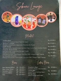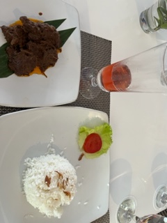 Today we are in Padang Indonesia. Truth be told that with the exception of Bali, we’ve not been impressed with Indonesia. Nothing about this place appealed to us so we decided to take a taxi to a restaurant to experience the most popular dish in Indonesia called Rendang. This part of the region is known for it’s culinary flavors. Rendang is a meat dish that is cooked at a low temperature for a long time in coconut milk and various Indonesian spices which are slightly spicy. Delicious! It was a little difficult to find a restaurant open today, as it is Ramadan and Muslims fast during the day. I took a picture of the menu because there was a section of ‘ladies beers’. π I had the strawberry beer – yummy.