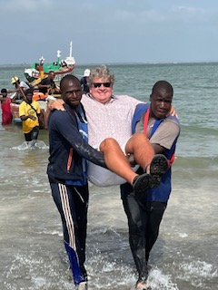 Let me start with the laughs. Our group of 7 were picked up from the ship and taken to the Gambia River to cross in order to get to the small town of Barra. Sounds easy enough – but – they had to carry us from the shore to the boat! Yes – CARRY US! I can not make this up. The women were easy, they just carried us like you would if you carried someone across the threshold. The men, however, were carried on the shoulders of the Gambian men!!! HAHAHA even Charlie! The looks on the faces of the men were priceless and really gave us giggles all day. I have a video to show so be sure to ask.