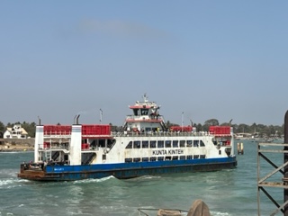 After driving back to the port in Barra, we were shuffled onto a ferry. Shuffled is really another way of saying dragged through crowds! Once on board the Ferry, 2 buses were loaded and then the gates opened for all other passengers to board. This was amazing chaos. It felt like a scene out of movie. We watched all the people in their colorful garb and they watched us as the only white people. In fact, when children saw us, they yelled ‘Two Bob’ aka ‘Toubab’ This is a term in Gambia as well as other West Africa countries to describe a white person or someone with lighter skin. It’s not derogatory, just a description. Our guide told us it was derived from the British when the children would ask for Two Bobs (two shillings). Again, we took chocolate and gave to the kids and made them smile.